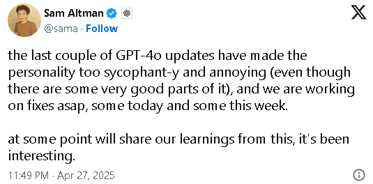 - Business Insider: ChatGPT has started really sucking up lately. Sam Altman says a fix is coming.